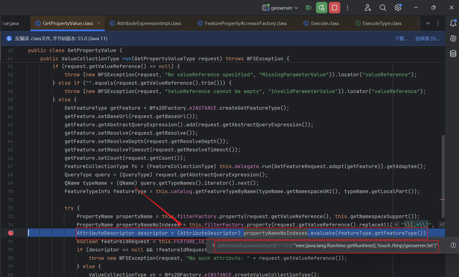 明白了geoserver的路由以后,我们看到GetPropertyValue#run方法,在前面会解析我们body中的xml来获取参数,其中propertyNameNoIndexs参数为我们的XPath语句