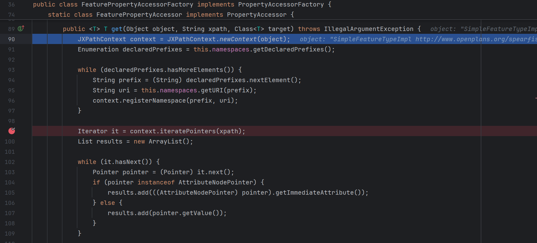 再跟进get方法,可以看到,先调用JXPathContext.newContext,然后调用context.iteratePointers(xpath)来解析xpath语句,从而达到RCE的效果