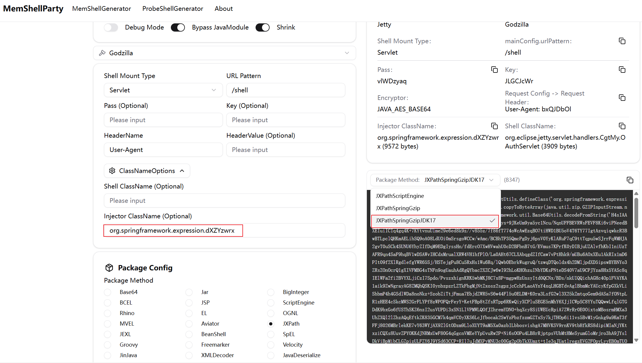 选择中间件为Jetty,利用方式为JXPath,打包方式为JXPathSpringGzipJDK17,且由于JDK17的强封装机制,注入器CLassName需要在org.springframework.expression下