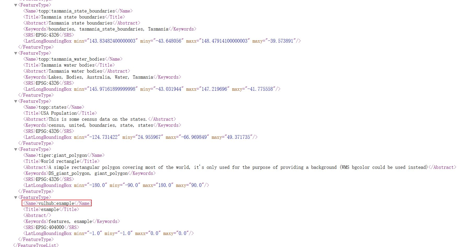 首先访问/geoserver/ows?service=WFS&version=1.0.0&request=GetCapabilities获取<Name>标签中的信息,地理图层列表
